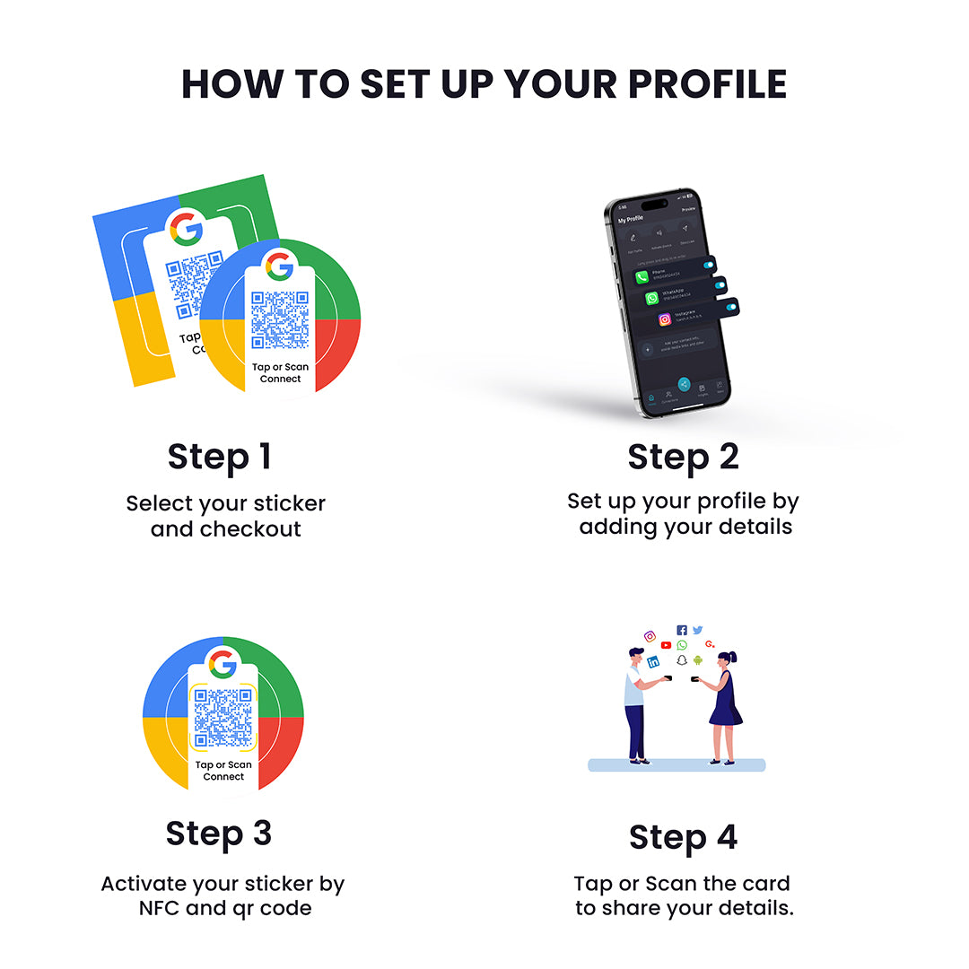 Smart business cards are a convenient and professional way to share your contact information with others. It lets you easily share your information with others simply by tapping your card against their device. It updates your details quickly saving you from the hassle of printing cards again and again. Most importantly, It helps you make connections without loosing it.