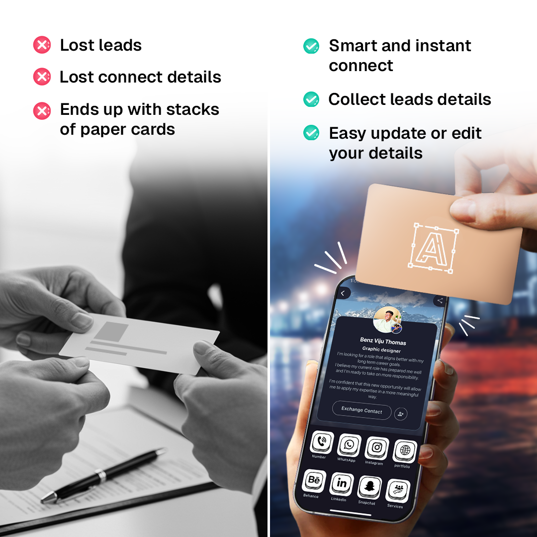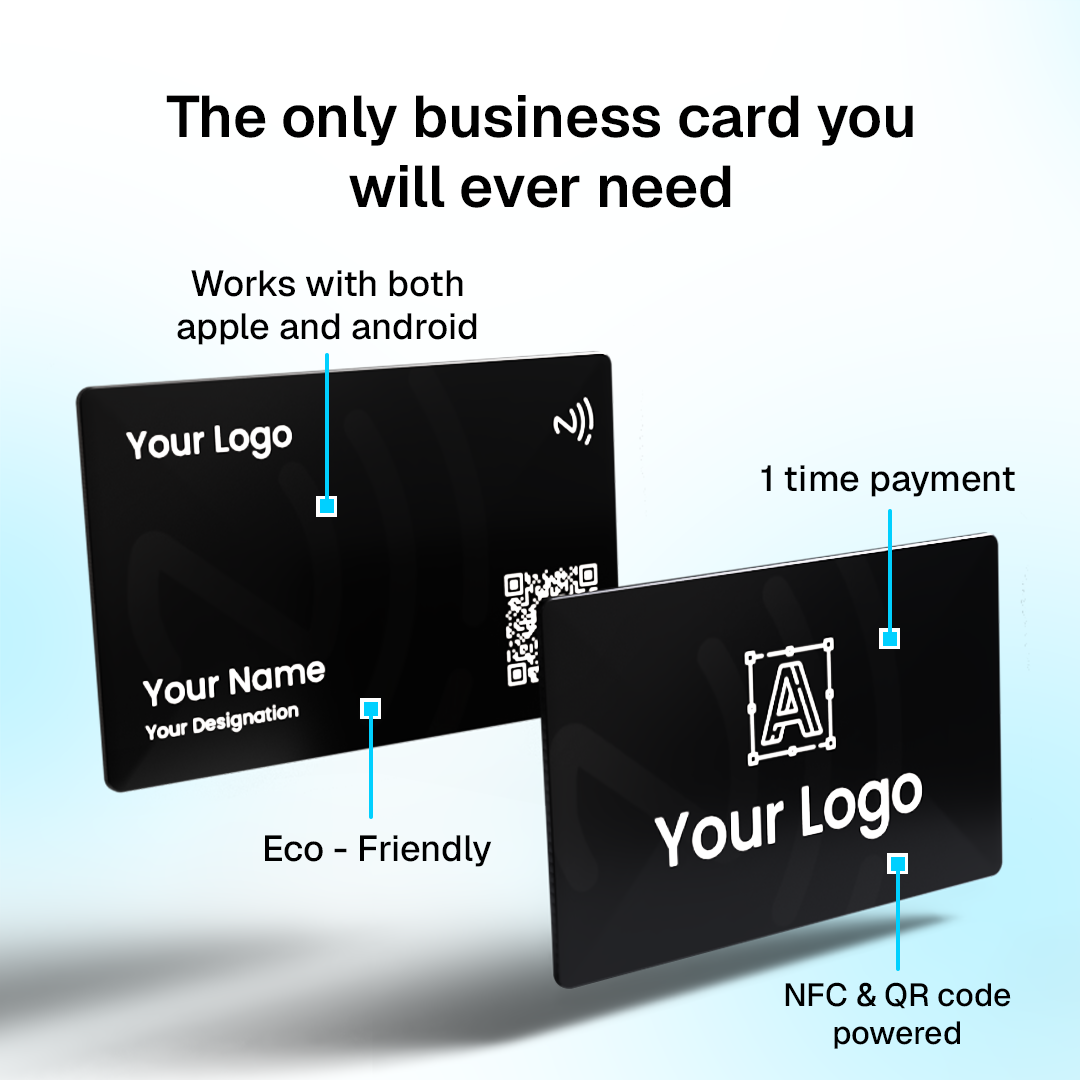 Smart business cards are a convenient and professional way to share your contact information with others. It lets you easily share your information with others simply by tapping your card against their device. It updates your details quickly saving you from the hassle of printing cards again and again. Most importantly, It helps you make connections without loosing it.